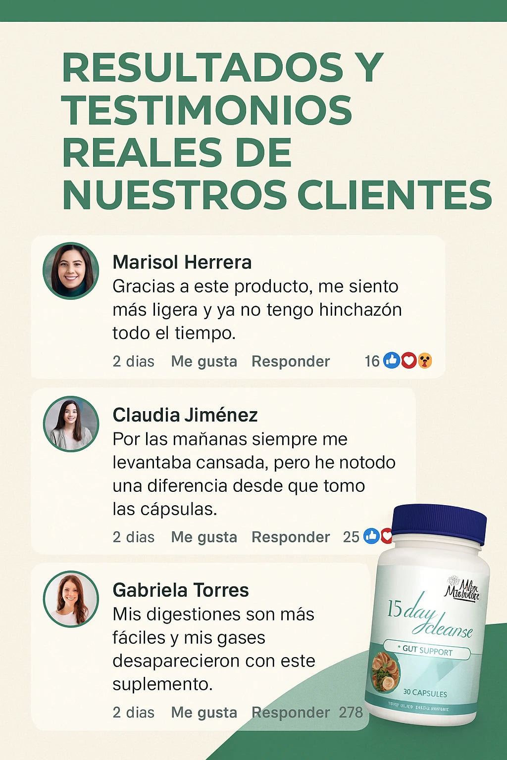 La mayoría de las personas nota mejoras en la digestión, menos hinchazón y más energía dentro de los primeros 7 a 10 días. Sin embargo, el programa completo está diseñado para 15 días de limpieza y apoyo digestivo.