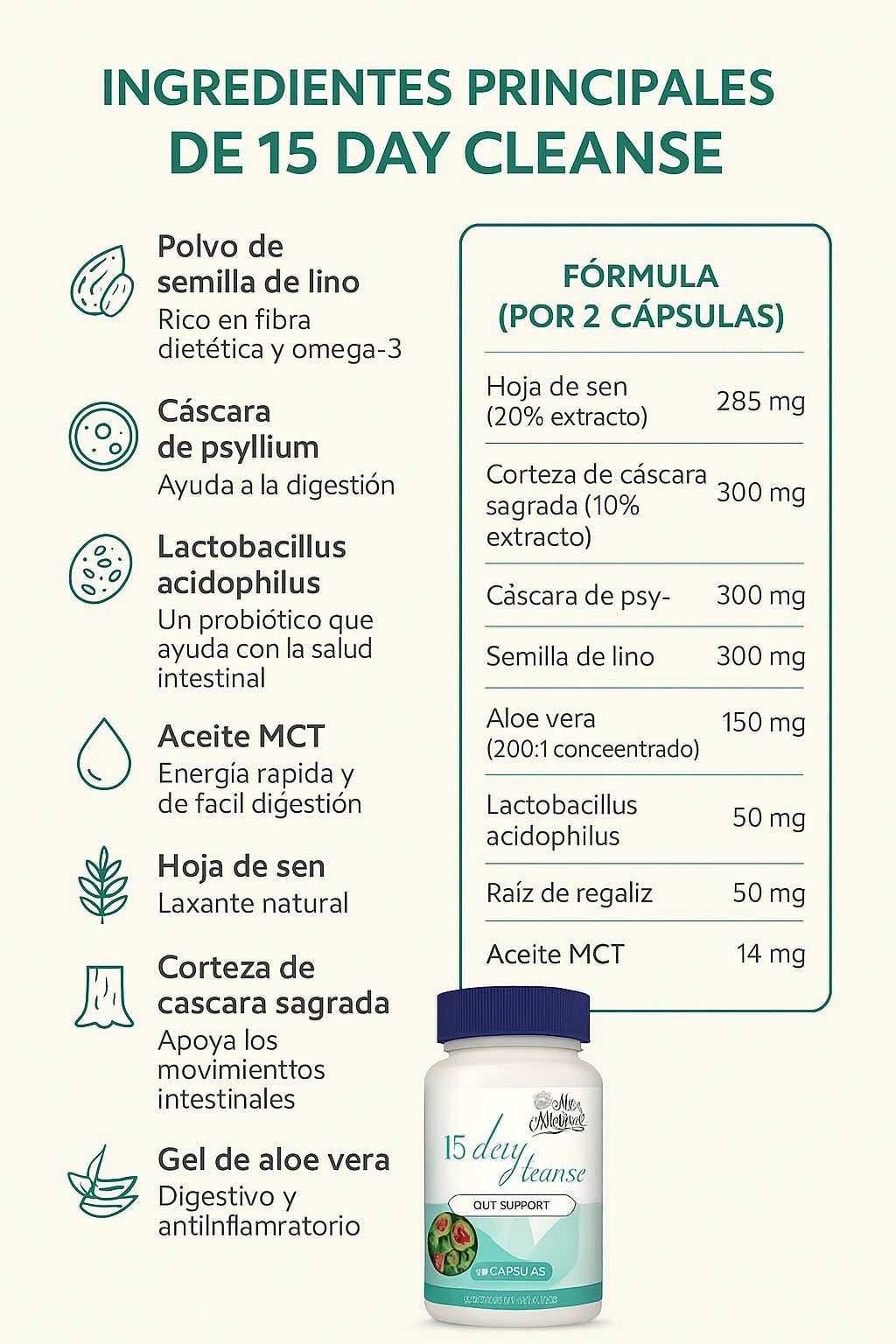 Sí, 15 Day Cleanse está elaborado con ingredientes naturales como hojas de sen, aloe vera, linaza, papaya y limón. No contiene químicos agresivos ni aditivos artificiales.